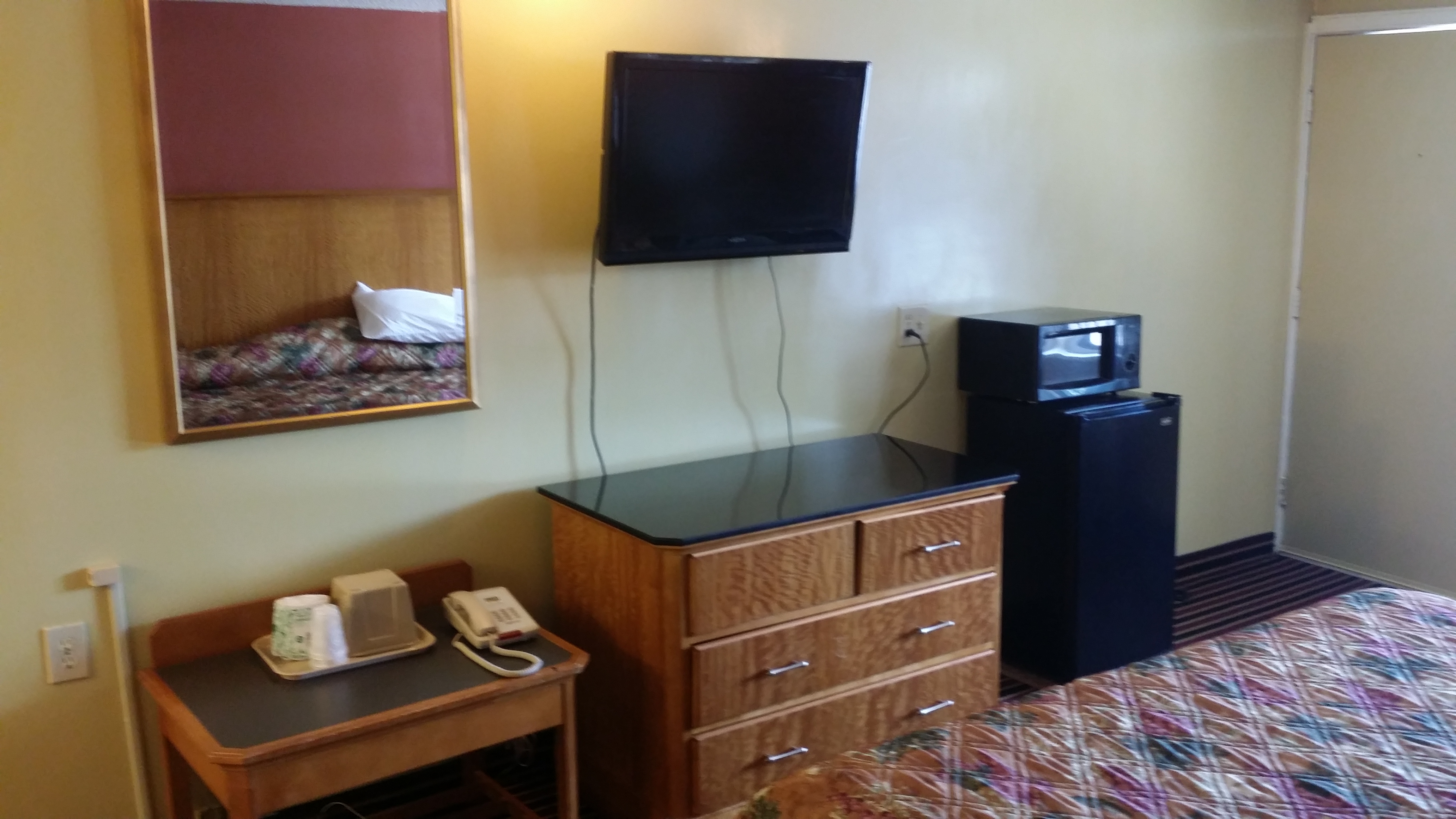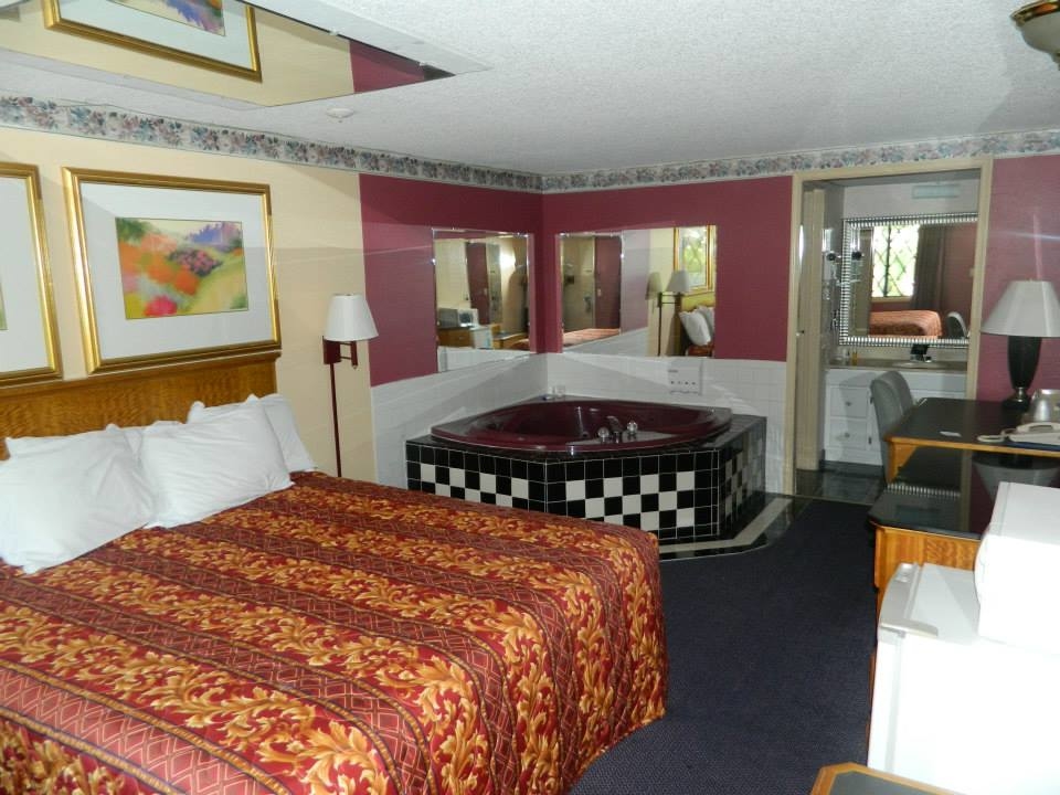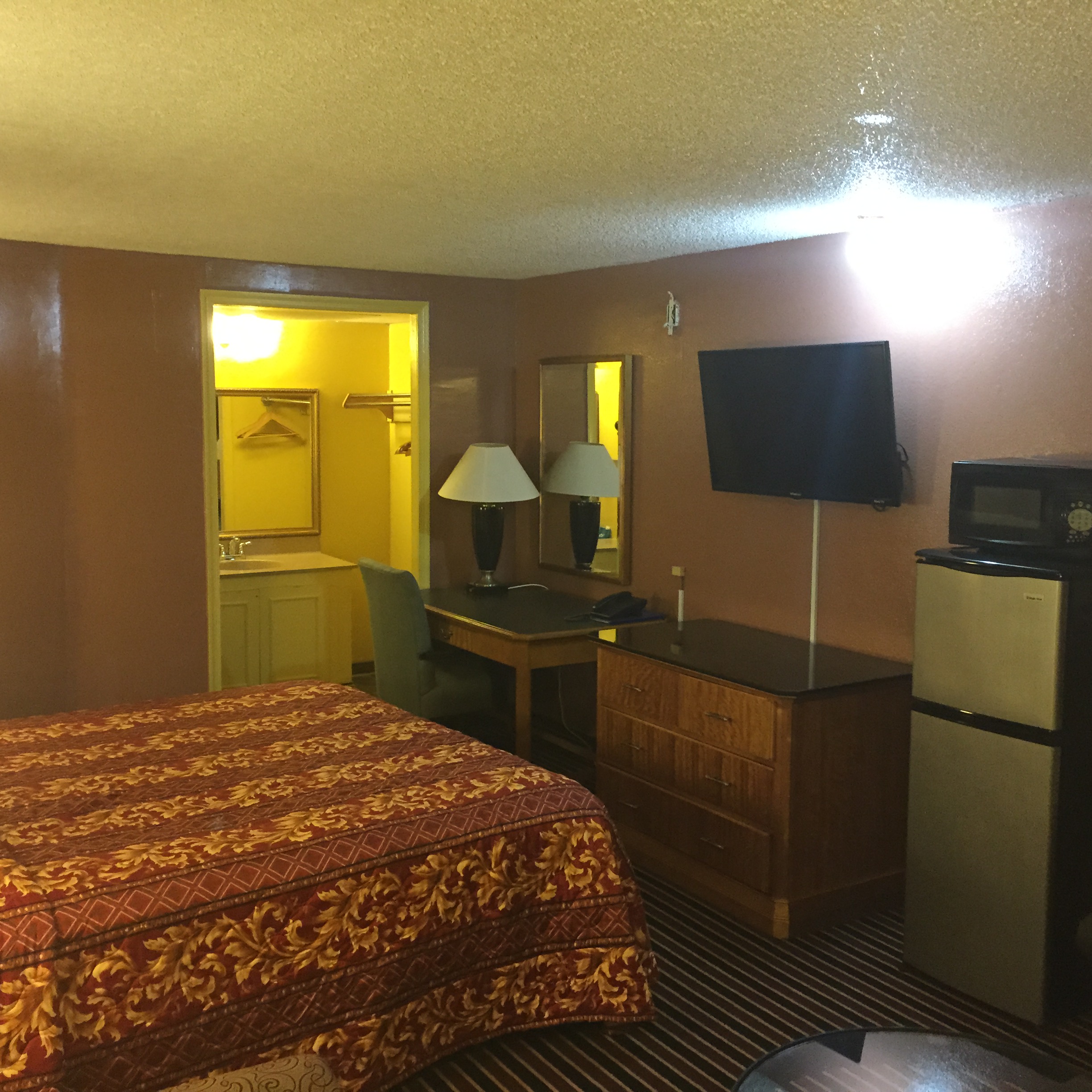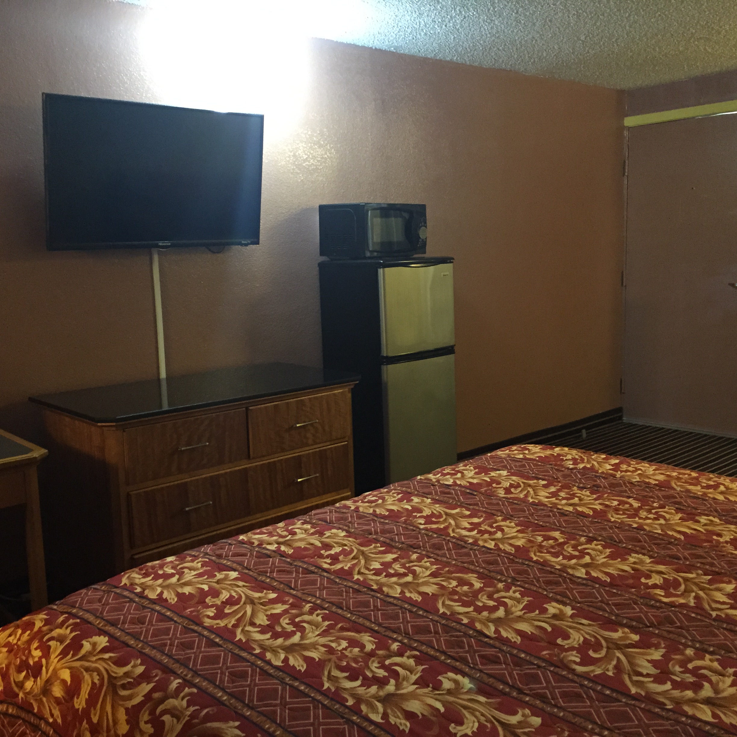 Spacious room with comfortable king size bedroom and other amenities such microwave, refrigerator, flat screen television, and free wi-fi. Our TV's all have wi-fi capability that allow you to stream favorite YouTube videos and other apps. Enjoy your stay by lounging around in the bedroom or visiting the many attractions available around us.